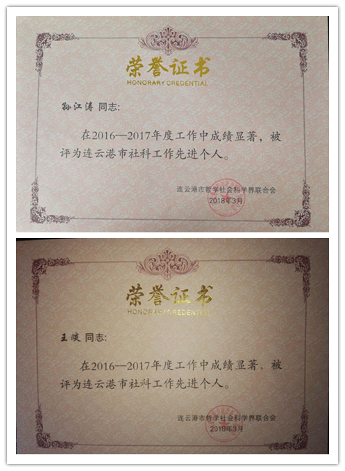 近日,连云港市社联第七届委员会第四次全体(扩大)会议在连云港市政府350会议室隆重召开。连云港市市委常委、宣传部长滕雯出席了会议。会议由连云港市社科联主席杨东升主持。杨东升在大会上宣读了题为 “为建设新时代‘一带一路’战略支点贡献智慧和力量”的工作报告,公布了“关于市社联第七届委员会部分常务委员和委员调整的决定(草案)”,宣读了“关于命名连云港市首批重点智库的决定”和 “关于表彰2016-2017年度连云港市社科工作先进集体和先进个人的决定”。我校李传江老师主持的连云港区域文化研究中心被命名为连云港市首批重点智库,我校社联被表彰为“2016-2017年度连云港市先进社联”,我校孙江涛老师和王琰老师被表彰为“连云港市社科工作先进个人”。特此祝贺!