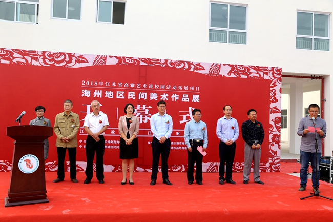 连云港市文化广电新闻出版局副局长周霞宣布2018年江苏省高雅艺术进校园拓展项目——海州地区民间美术作品展开幕。参加开幕式的领导、来宾和广大师生参观了展览。