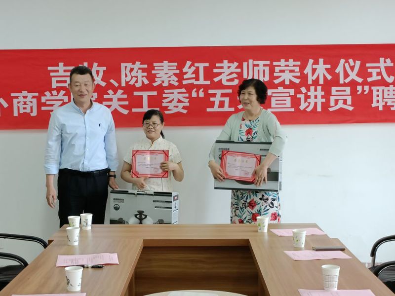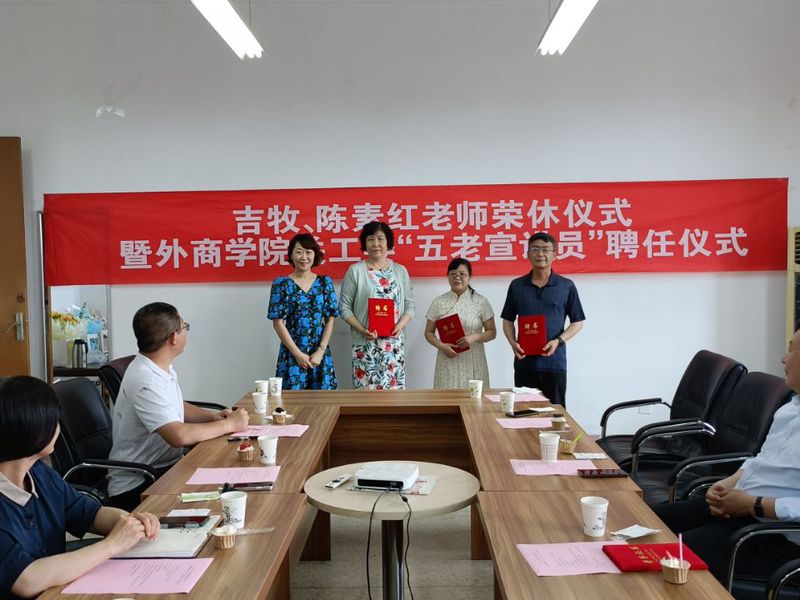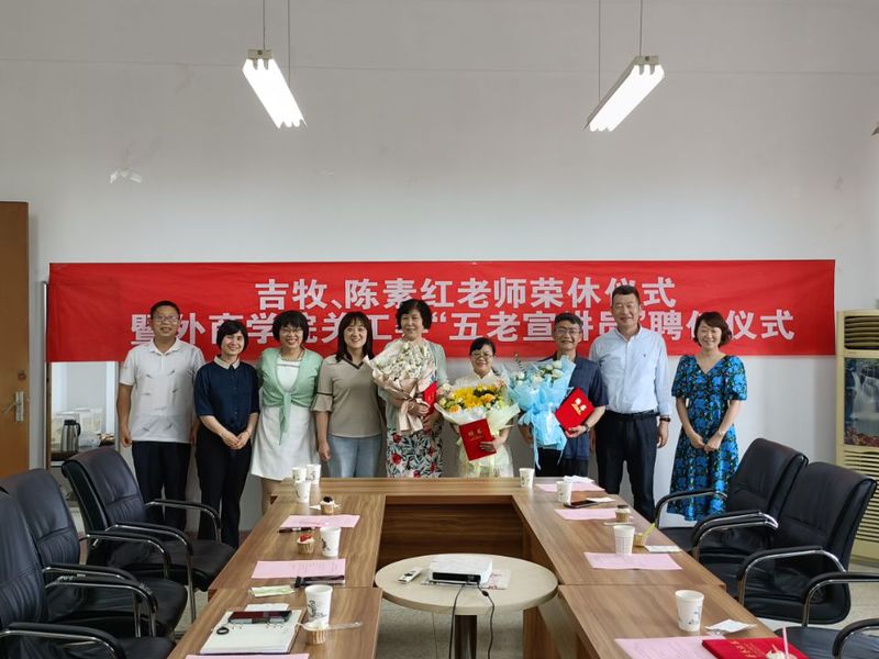 6月15日,外语与商务学院在大同楼A413室举行了简单而隆重的荣休仪式暨外商院关工委“五老宣讲员”聘任仪式,为吉牧和陈素红两位老师送上荣休祝福,同时聘任两位退休教师和戴杰老师为外商院关工委“五老宣讲员” 。校党委宣传部部长、工会主席赵明,院领导班子全体成员,学院部分教职工代表参加了此次活动。仪式由外商院党总支副书记孙虎林主持。