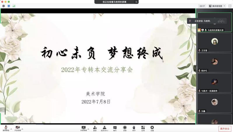 2022年是江苏省专转本选拔考试改革第一年(新大纲第一年),对于23、24年考试的学生有很多的借鉴意义,为满足学院学生对专转本考试深入了解的需求,激发在校学生的转本热情,进一步帮助学生设定学习目标、明确学习方向、掌握学习技巧、增强学习动力、做好学习规划,美术学院于7月8日晚20点组织线上专转本考试分享交流会。2020级、2021级学生以及2019级优秀毕业生代表近300名师生参加了本次分享会,会议由院党总支副书记马聪主持。