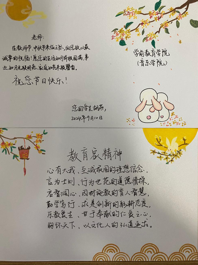 为庆祝第40个教师节和一年一度的中秋节,学前教育学院(音乐学院)于8月31日至9月11日精心策划并举办了以“大力弘扬教育家精神,加快建设教育强国”为主题的系列庆祝活动。