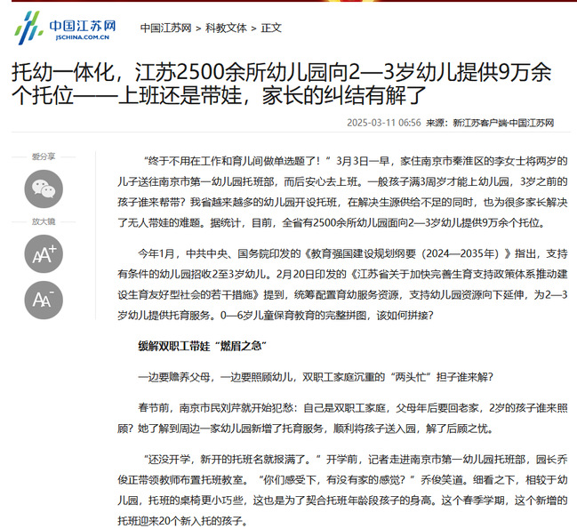 【中国江苏网】托幼一体化,江苏2500余所幼儿园向2—3岁幼儿提供9万余个托位——上班还是带娃,家长的纠结有解了