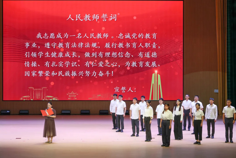 9月10日,在第41个教师节来临之际,学校在大学生活动中心多功能厅隆重举行“师者筑梦,共启新程”庆祝大会,大会以“以教育家精神铸魂强师,谱写教育强国建设华章”为主题。