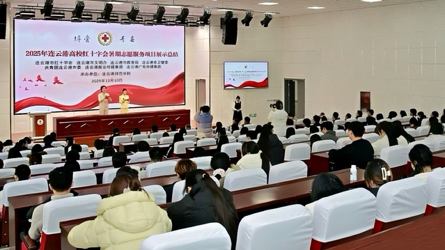 近日,2025年连云港高校红十字会暑期志愿服务项目展示总结会在我校百川楼第二学术报告厅举行。市委宣传部三级调研员梁龙峰,市教育局副局长蒋猛,市卫健委副主任、党委委员蔡明,连云港报业传媒集团党委委员、副总编辑顾红,连云港广电传媒集团党委委员、副总经理、副台长谢春芳,市红十字会党组成员、秘书长徐育军出席,市6所高校、高职院校红十字会相关负责人和项目指导老师、志愿者代表共150余人参加活动。
