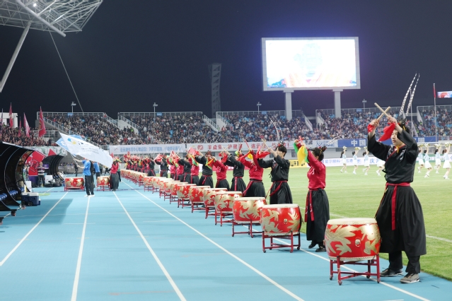 4月11日,2026江苏省城市足球联赛(连云港VS盐城)比赛在连云港市体育中心火热开赛。连云港师范学院120余名学生以灵动的舞姿、雄浑的鼓声、热情的互动,将朝气蓬勃的青年风采与山海港城的文化底蕴融合,以精彩纷呈的开场表演点燃赛场气氛,成为绿茵场上一道亮丽的风景线。